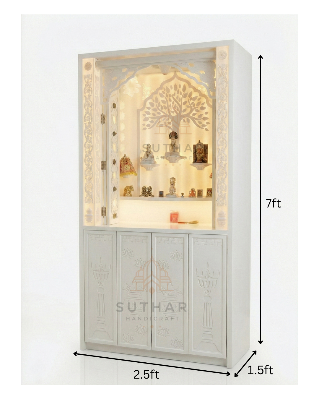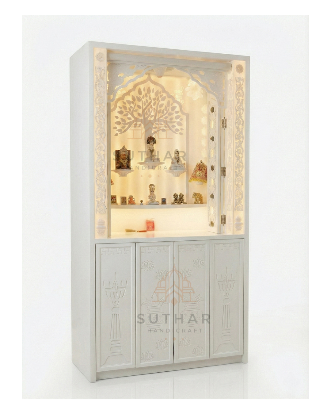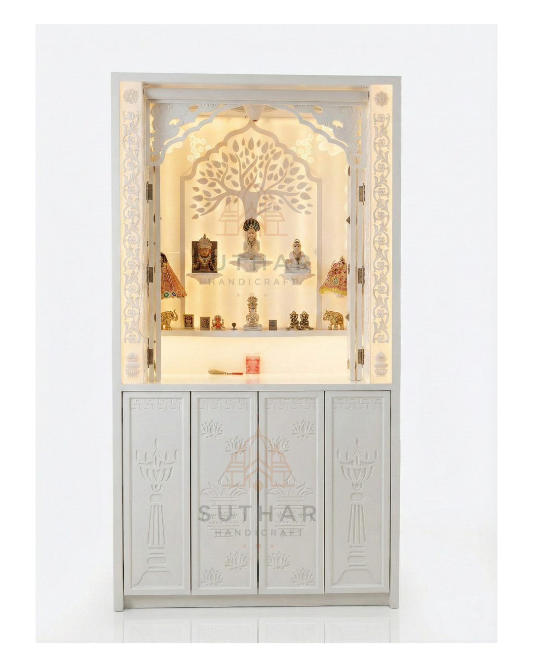 The lotus shelves symbolize purity and devotion, making this 4 fold door corian mandir spiritually complete and visually harmonious.
