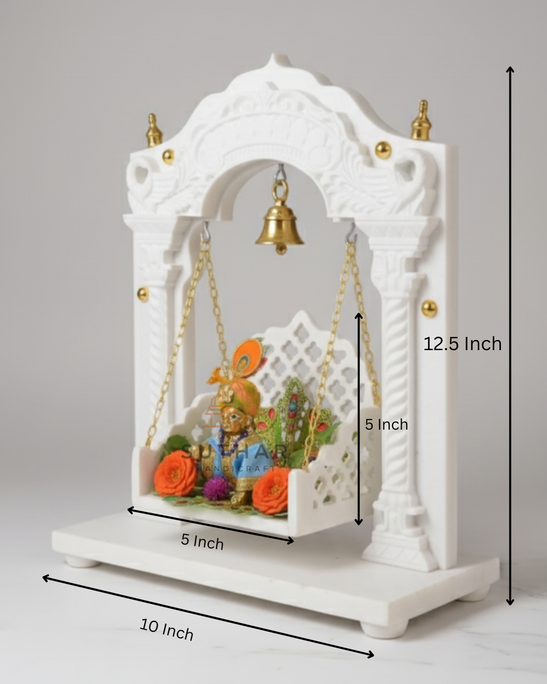 The Jhula measures 12.5 inches in height, with a base of 10 inches by 5 inches, and a swinging seat of 5 inches by 5 inches, designed to securely accommodate idols. The white Corian surface offers a smooth finish, resistant to moisture, scratches, and daily wear, making it ideal for long-lasting use in the pooja room.