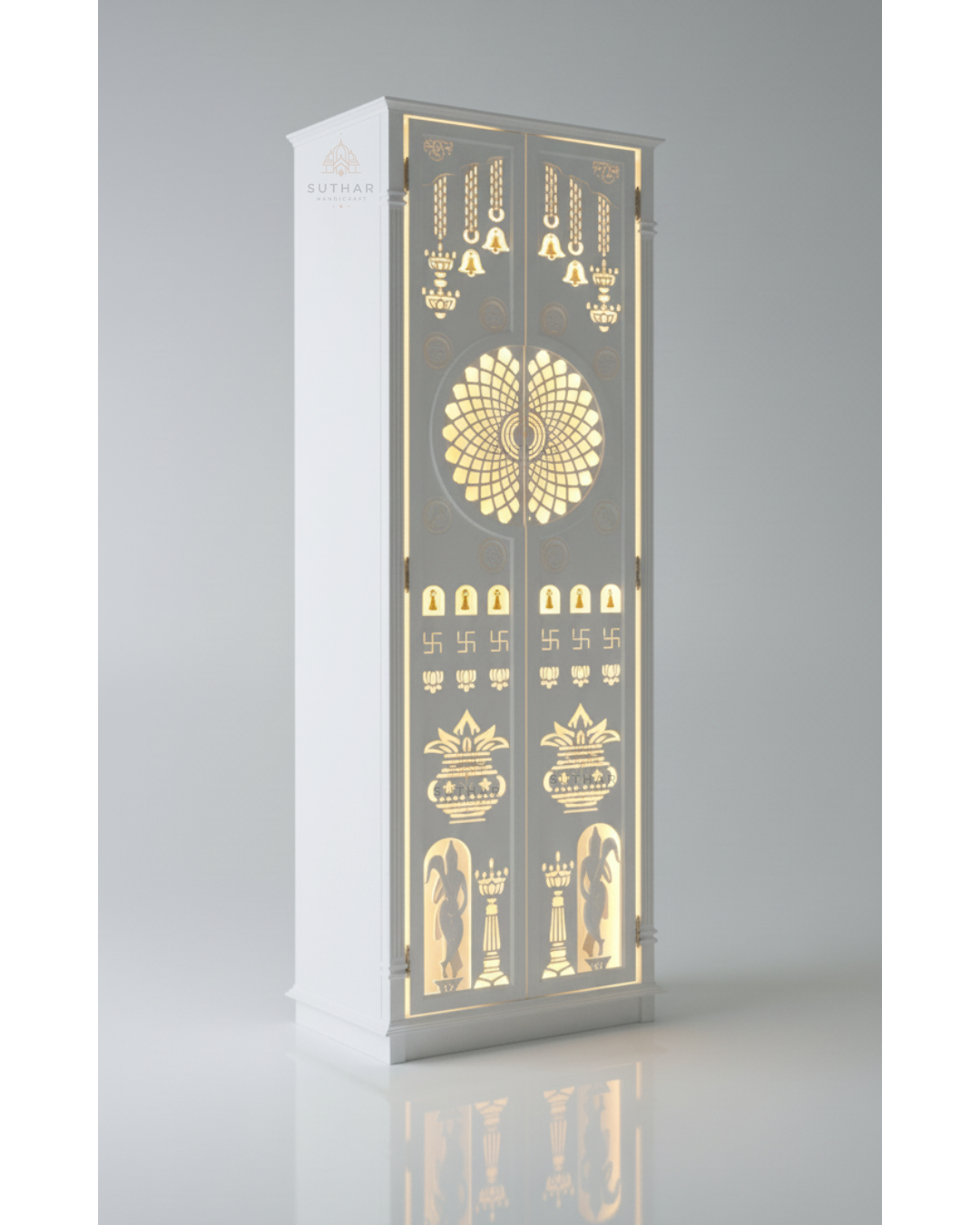 The Designer Corian Mandir combines spiritual charm with contemporary aesthetics. The white matte Corian body radiates purity, while the golden backlight adds warmth and serenity. The vertical structure makes it ideal for apartments or compact pooja corners, offering grandeur without consuming much space.