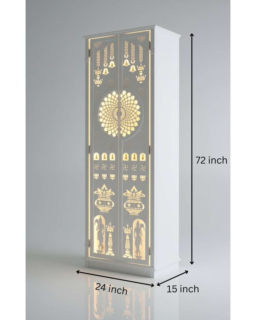 Standing tall at 72 inches, with a width of 24 inches and depth of 15 inches, this mandir creates a majestic presence in any home or office. The laser-cut backlit doors feature intricate patterns inspired by Indian spiritual symbols — including Swastik, Kalash, Diya, and Bells — beautifully illuminated with a soft golden LED glow.