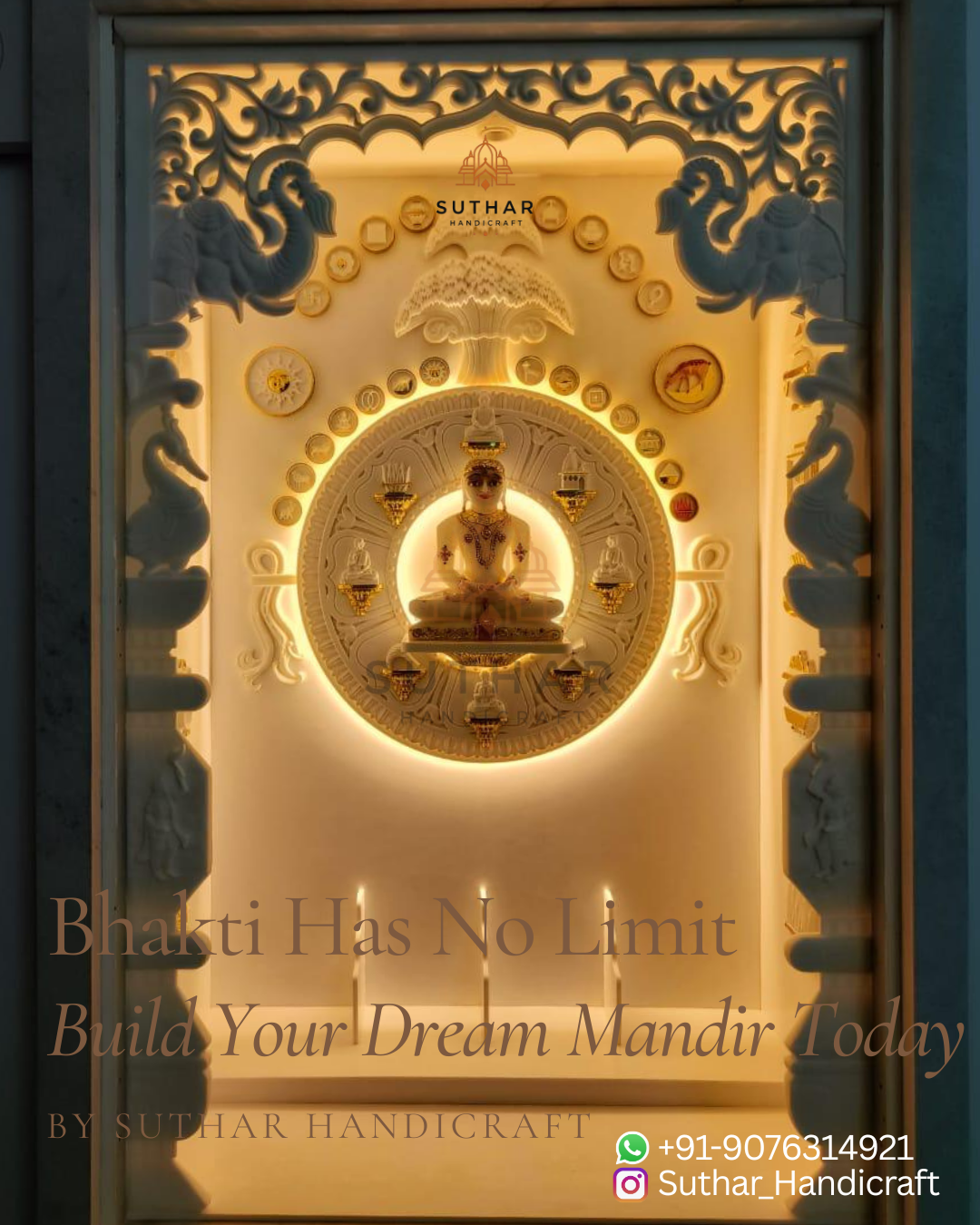 Discover divine elegance with this doorless Corian Mandir, a masterpiece of craftsmanship and devotion by Suthar Handicraft. Unlike traditional designs, this mandir replaces pillars with intricately carved motifs, giving it a unique and timeless charm. The warm backlit illumination enhances its detailed carvings, creating a serene aura that transforms your prayer rituals into moments of peace and spirituality.