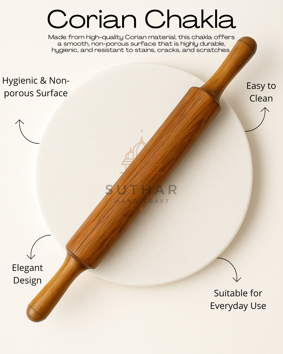 The round design provides ample space for easy dough rolling, giving you the perfect surface to create soft, evenly rolled rotis every time. Unlike traditional wooden chaklas, the Corian material is easy to clean, requires no special maintenance, and is highly heat and moisture resistant, making it ideal for long-term kitchen use.