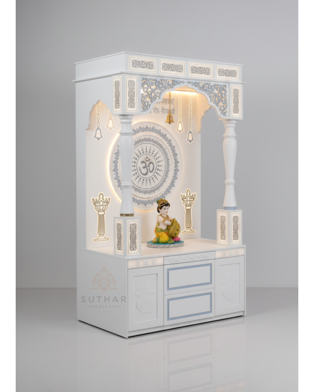 On both sides, you’ll find elegantly carved MDF round pillars, carefully handcrafted and coated in a premium white finish. These pillars not only add strength but also elevate the mandir’s regal appearance, giving it the look of a temple within a home. Every corner of this structure has been shaped with artistic precision, combining modern technology and traditional design principles.