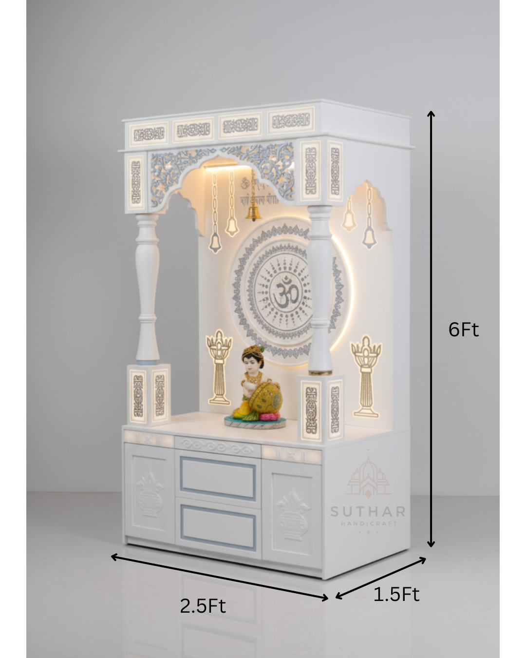 The mandir’s dimensions — Height: 6 Ft, Width: 2.5 Ft, Depth: 1.5 Ft — make it a perfect fit for home interiors, office spaces, and entrance areas. Despite its grand appearance, it remains compact enough to blend into modern apartment layouts.