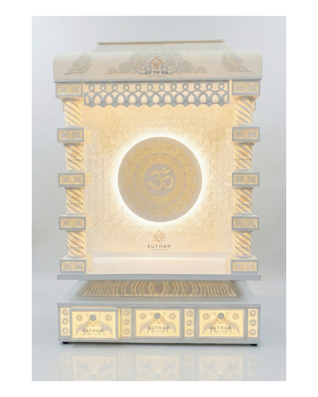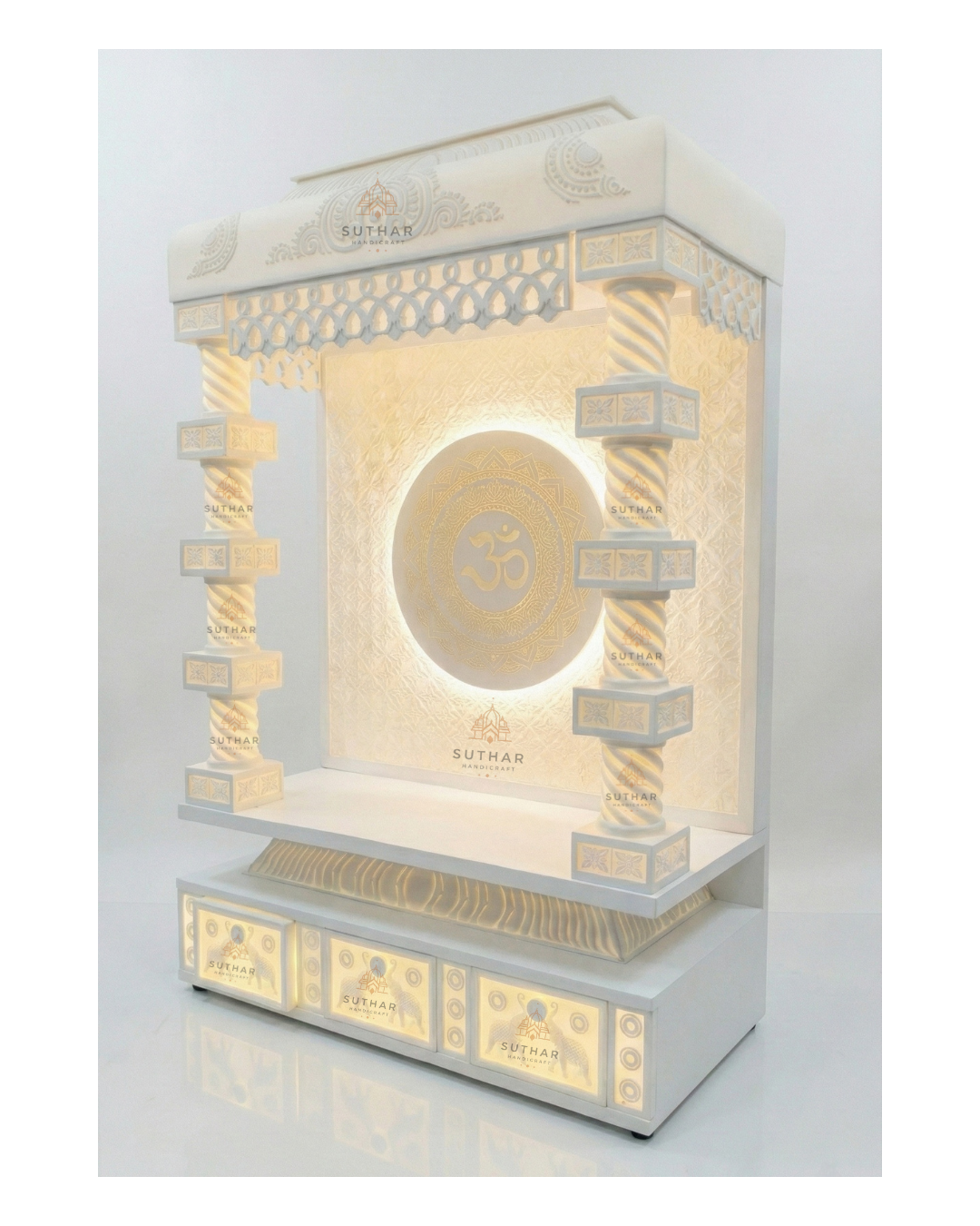 Bring divine elegance to your home with this round light pillar mandir, handcrafted in premium Corian by Suthar Handicraft. Designed with round pillar corian mandir architecture, mandala Om back panel, designer lighting, and 3D storage drawers, this designer corian mandir blends traditional devotion with modern craftsmanship, making it a perfect luxury corian mandir for Mumbai homes.