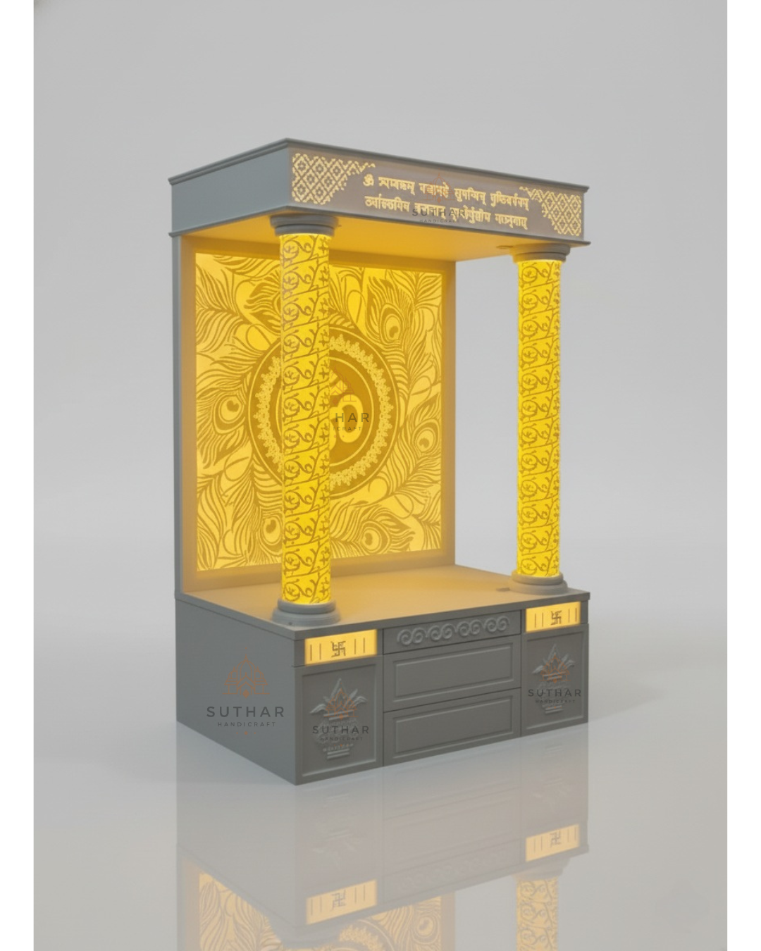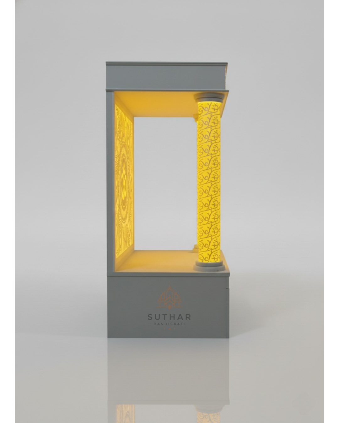 Each pillar is crafted with intricate detailing, precisely cut patterns, and smooth polishing—hallmarks of Suthar Handicraft Corian Mandir workmanship. The lighting embedded inside the pillars is engineered for soft illumination, creating a calm, peaceful, temple-like feel during aarti, meditation, or evening pooja.